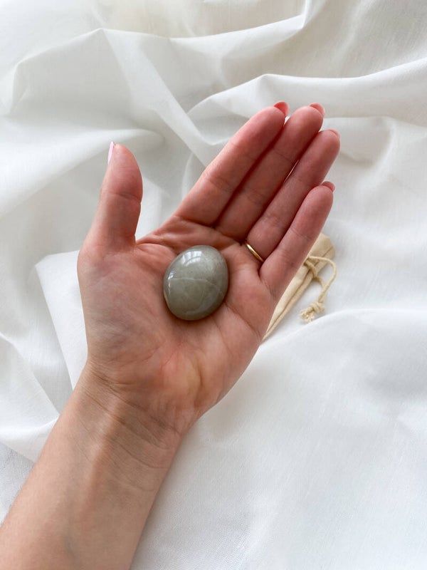 Small pocket Green Moonstone, polished by hand, in small La Luna bag. You will receive a small explanation about the stone in the bag.