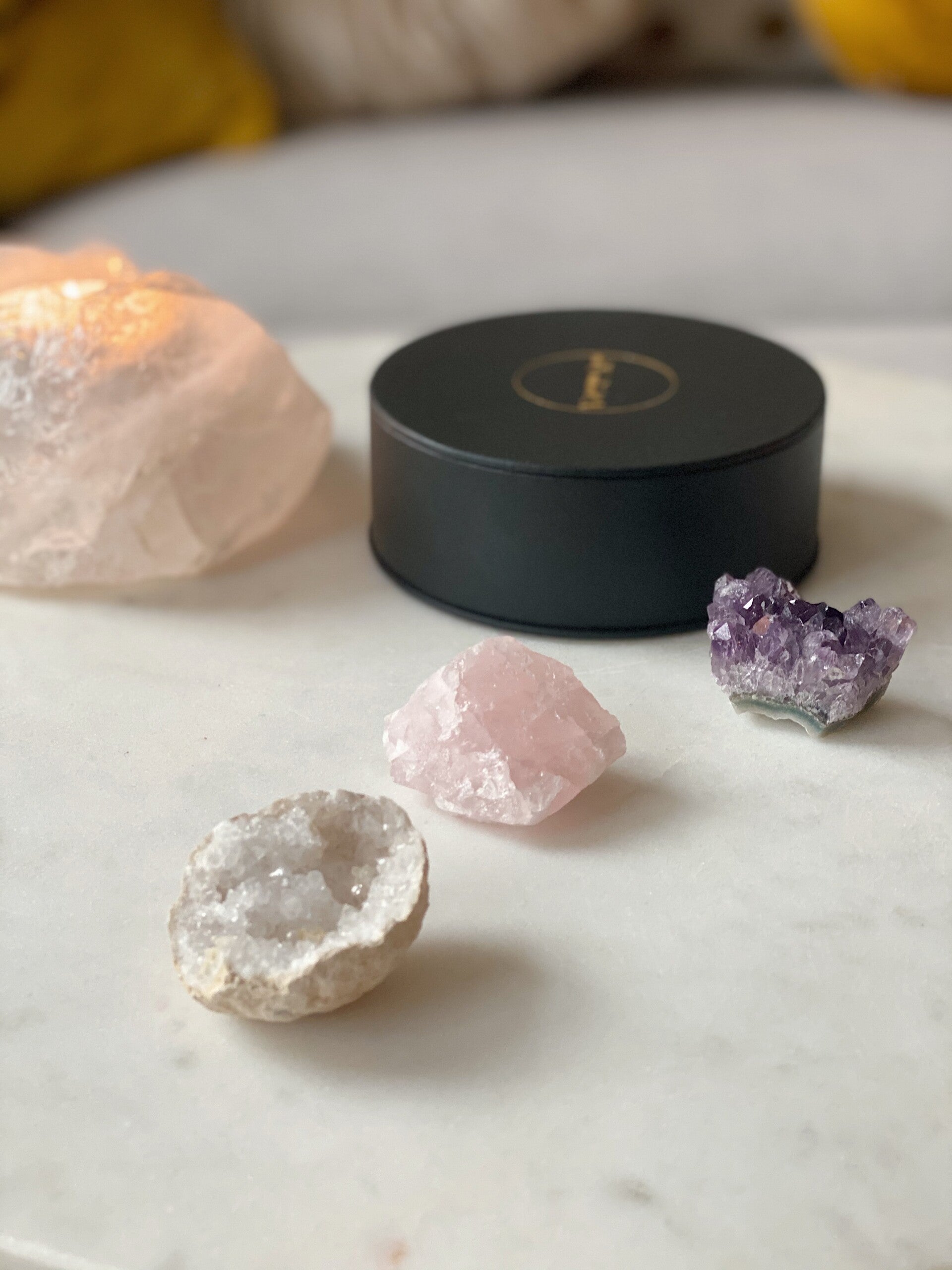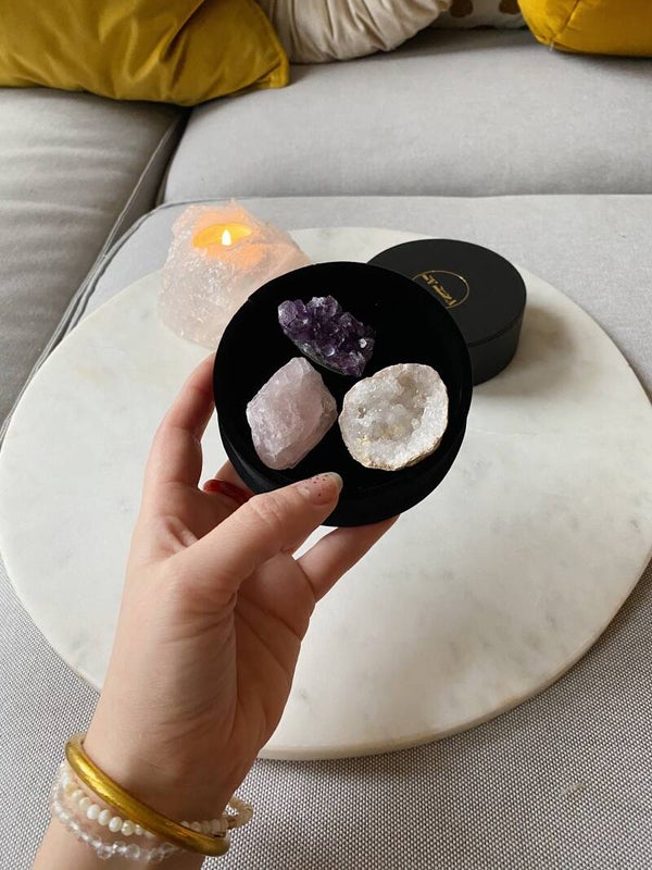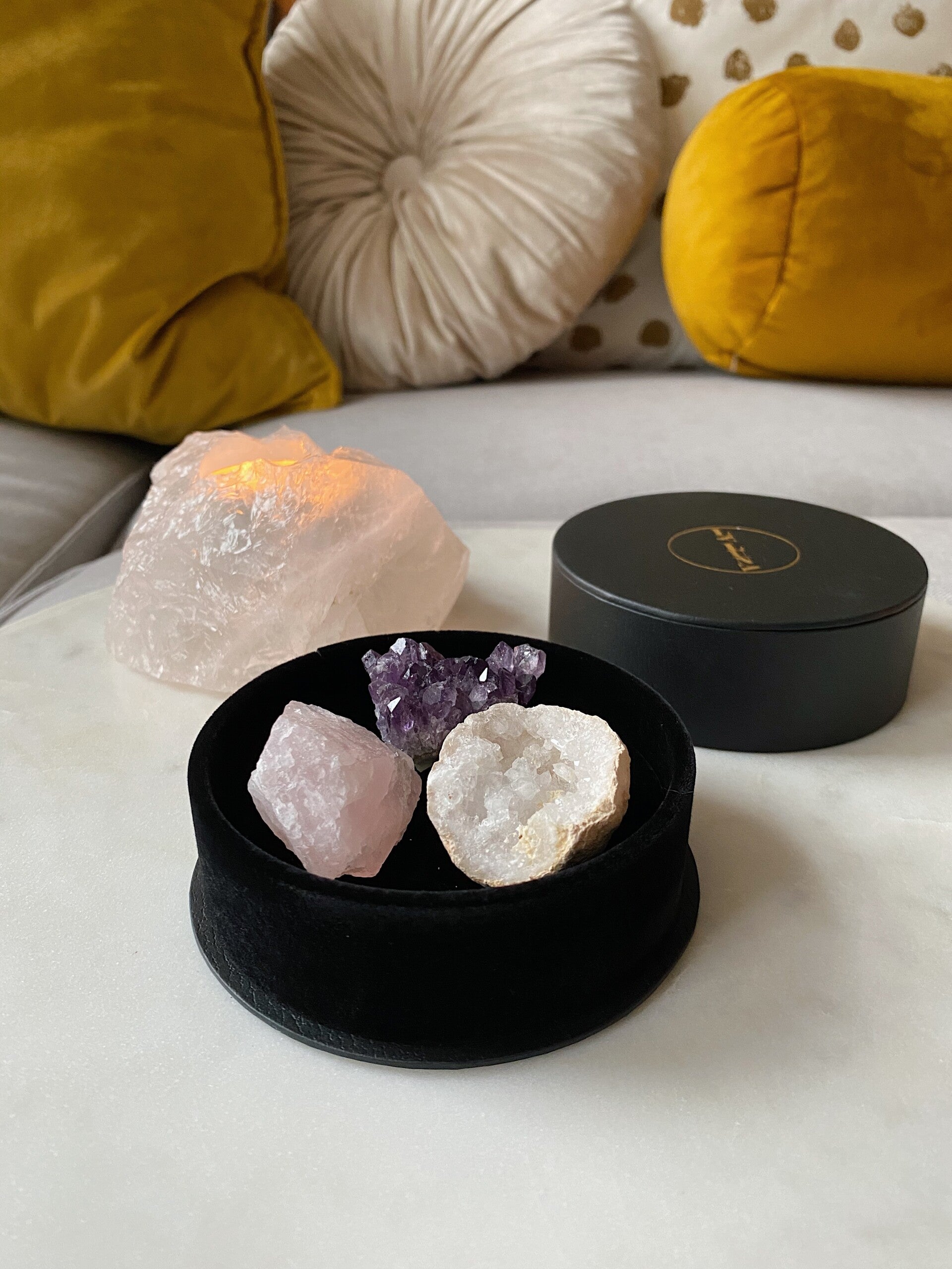 Amethyst for relaxation, Rose Quartz for love and Rock Crystal for cleaning the energy. Together they make a perfect trio, strengthening each others healing powers.