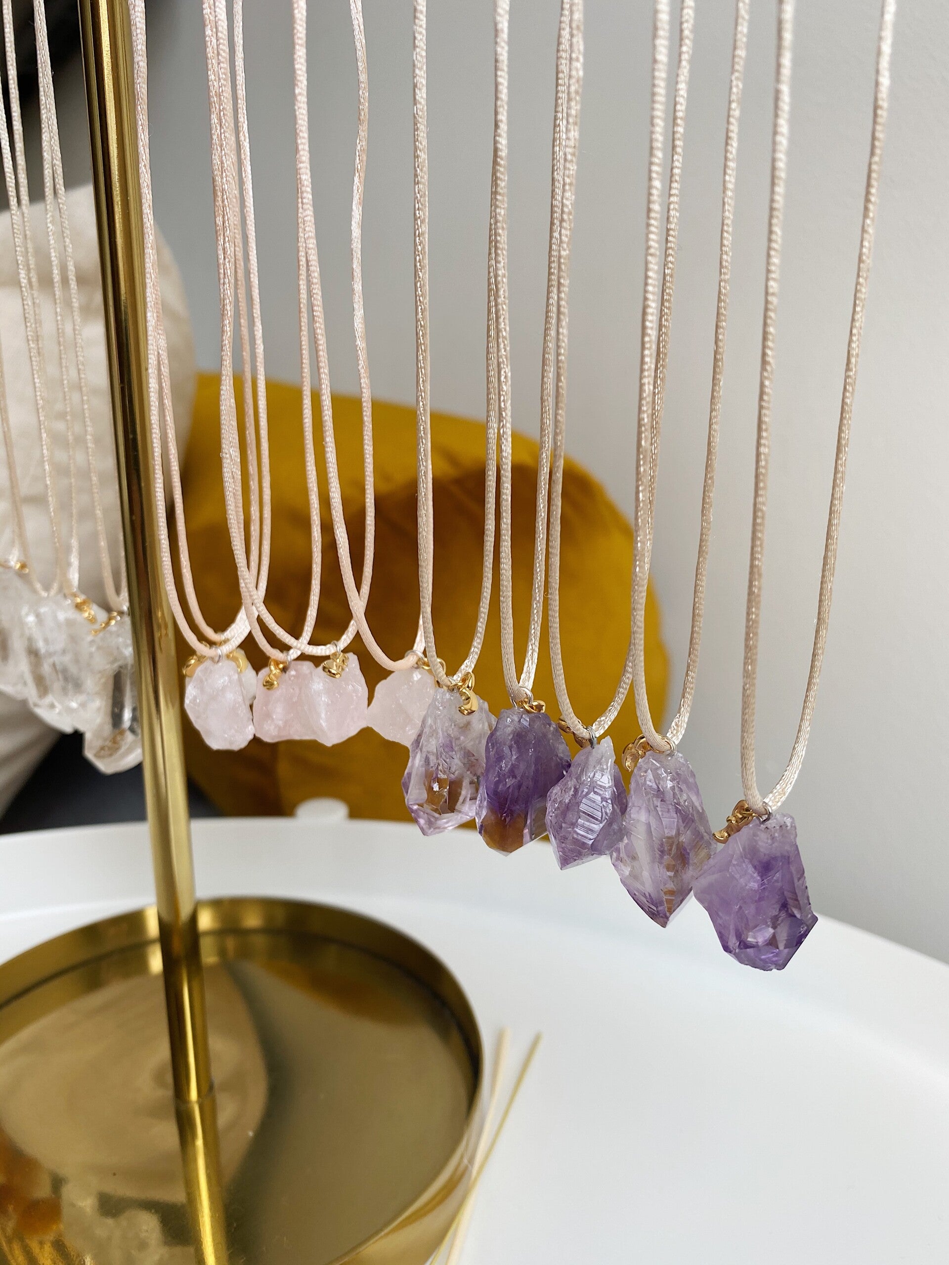 Our Rose Quartz hanger has a peachy pink satin cord.