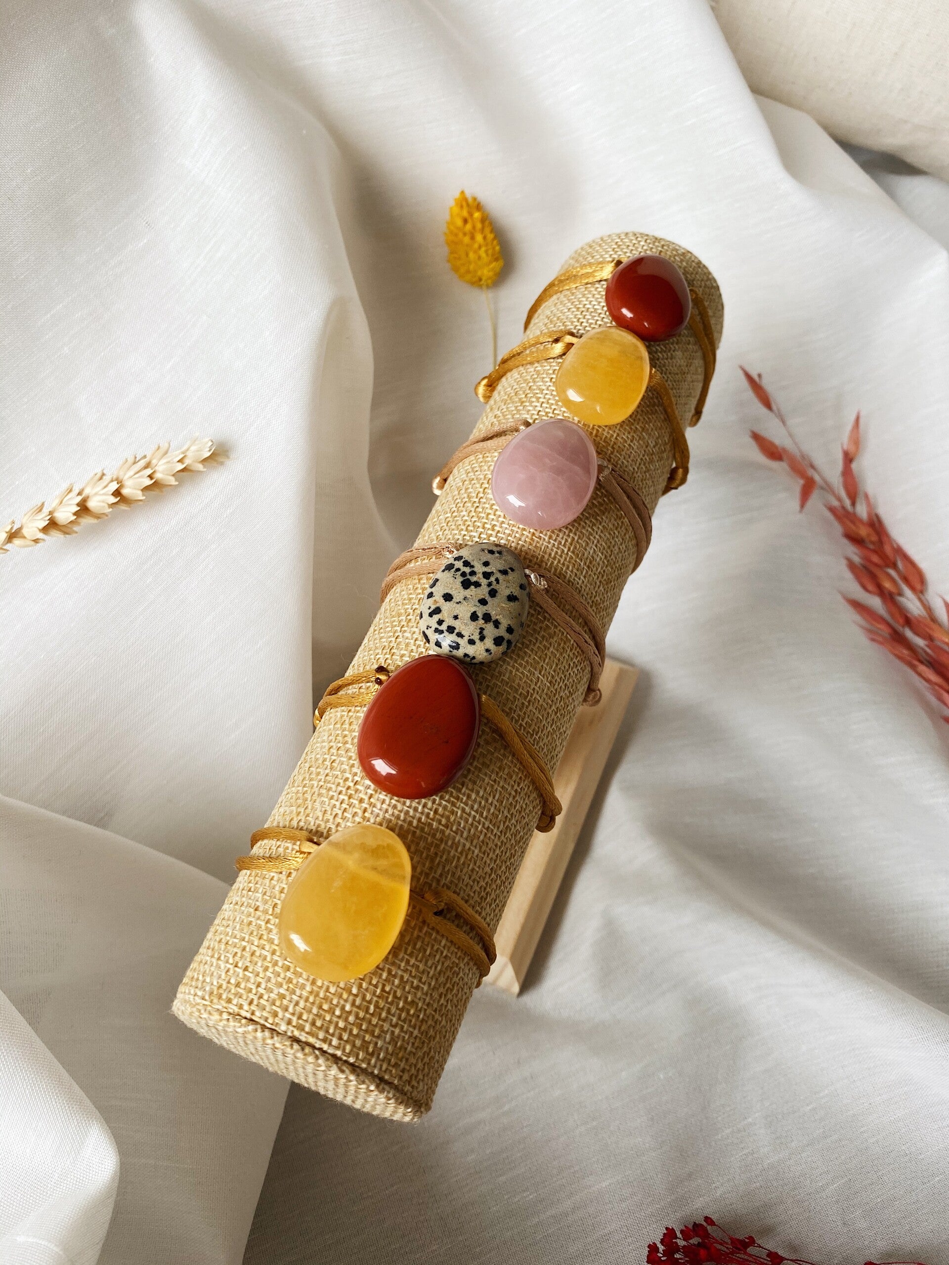 The satin cord is adjustable to a maximum of +/- 22 centimeters round. You can either wear it as a center piece on your wrist, or make them even more powerful by mixing them with some other small bracelets. These pretty gems will compliment each outfit, guaranteed!